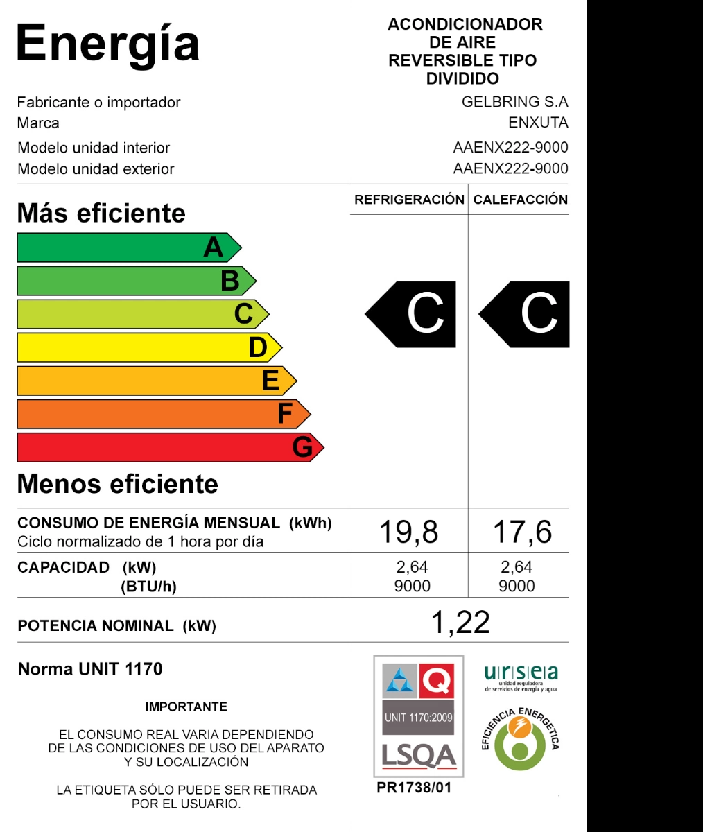 Aire Acondicionado 9.000 BTU con Gas R32 Clase C