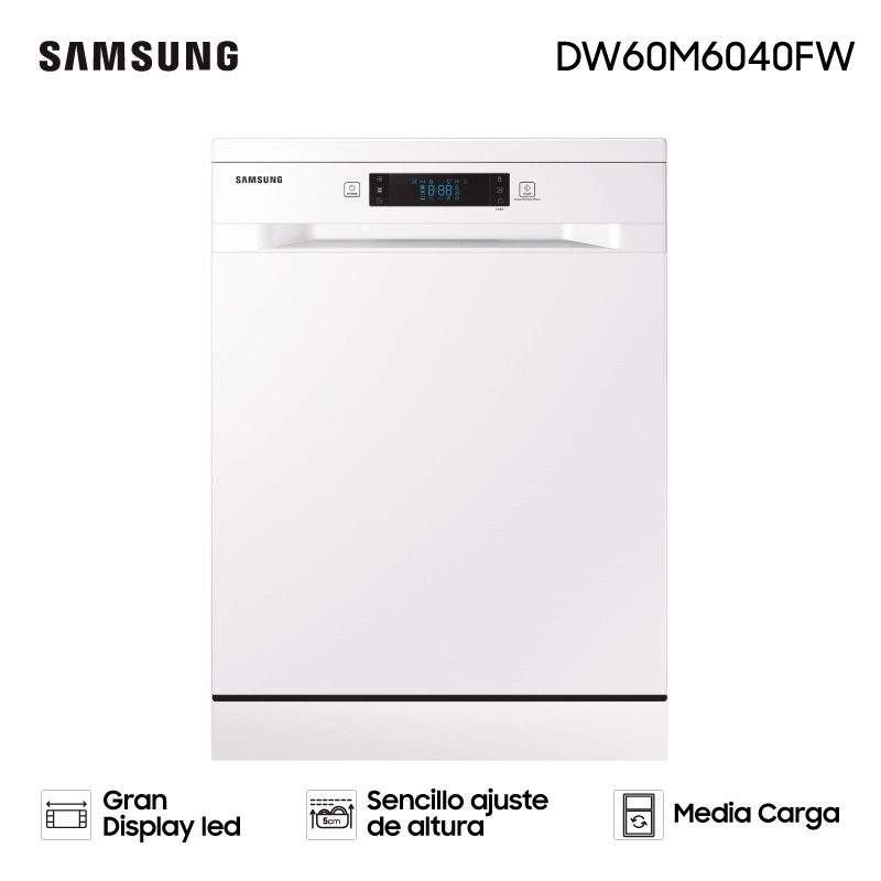 Rendimiento eficiente, funciones avanzadas y un manejo intuitivo para obtener una limpieza completa en cada ciclo. Características destacadas: Capacidad: 13 cubiertos (comensales) 6 Programas de lavado: Intensivo, Auto, Delicado, Eco, Express, Prelavado Display digital intuitivo Tipo de lavado: Giratorio Opción Media Carga Cesta superior con altura regulable Función Desinfectante con agua caliente Programa rápido de 60 min Porta cubiertos Bloqueo para niños Inicio diferido Funciones principales: Lavado giratorio: Los brazos aspersores distribuyen el agua a presión de forma uniforme asegurando una limpieza eficiente en todas las zonas de carga. Función Higiene: Prolonga la fase de aclarado final y eleva la temperatura del agua hasta 70°C para una limpieza más profunda, eliminando bacterias y gérmenes. Aclarado final: Elimina residuos, mejora el secado y evita las manchas en la vajilla.